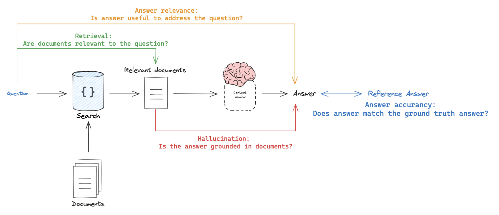 - Require reference output: Compare the RAG chain's generated answer or retrievals against a reference answer (or retrievals) to assess its correctness.
